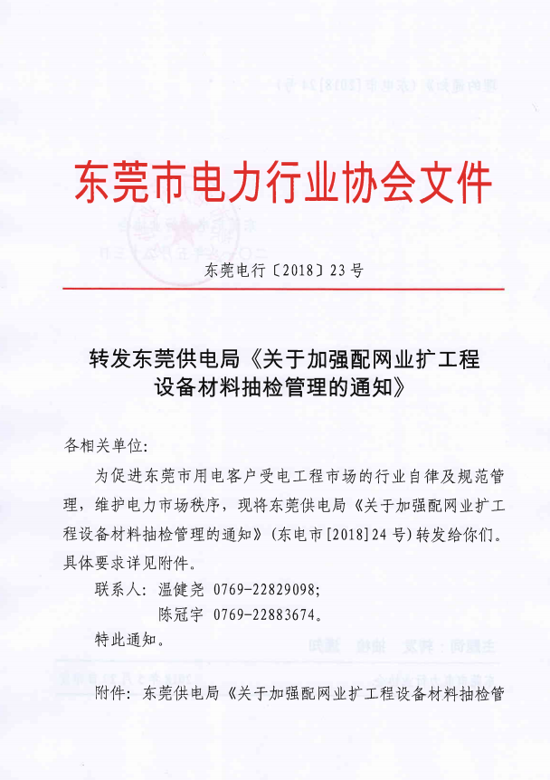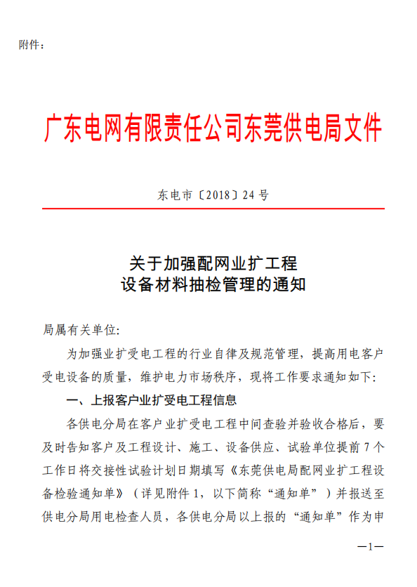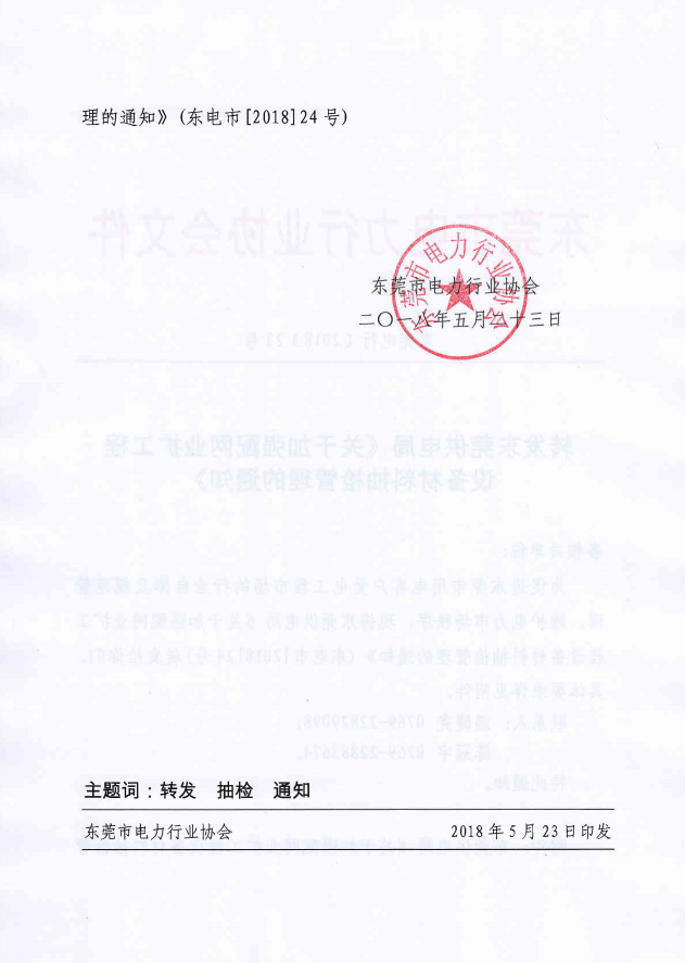 東莞電行〔2018〕23號(hào)--轉(zhuǎn)發(fā)東莞供電局《關(guān)于加強(qiáng)配網(wǎng)業(yè)擴(kuò)工程設(shè)備材料抽檢管理的通知》