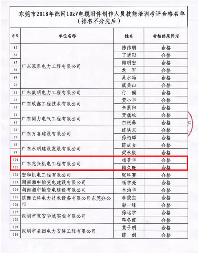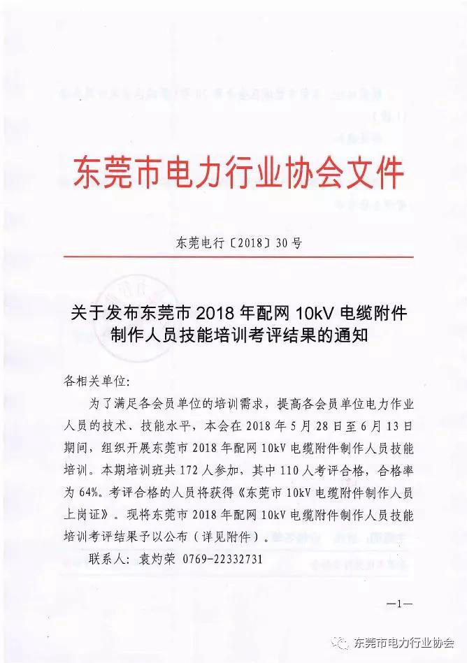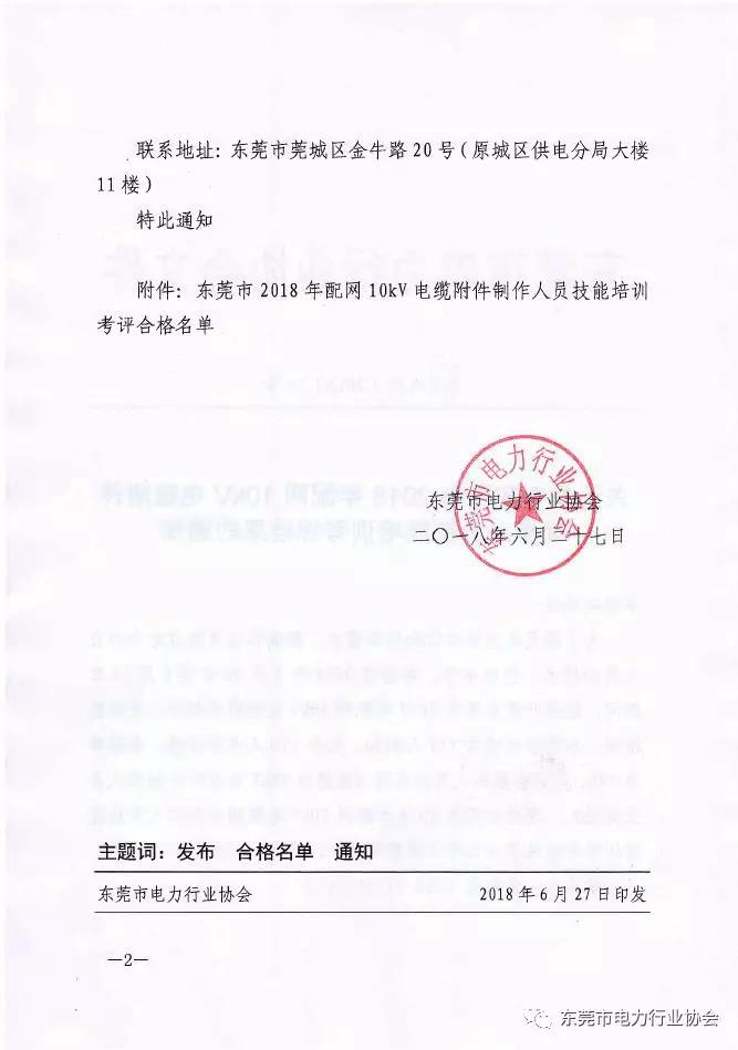 為了提高我司電力作業人員的技術、技能水平,我司指派陶工、楊工參加東莞市電力行業協會組織的東莞市2018年配網10kV電纜附件制作人員技能培訓。